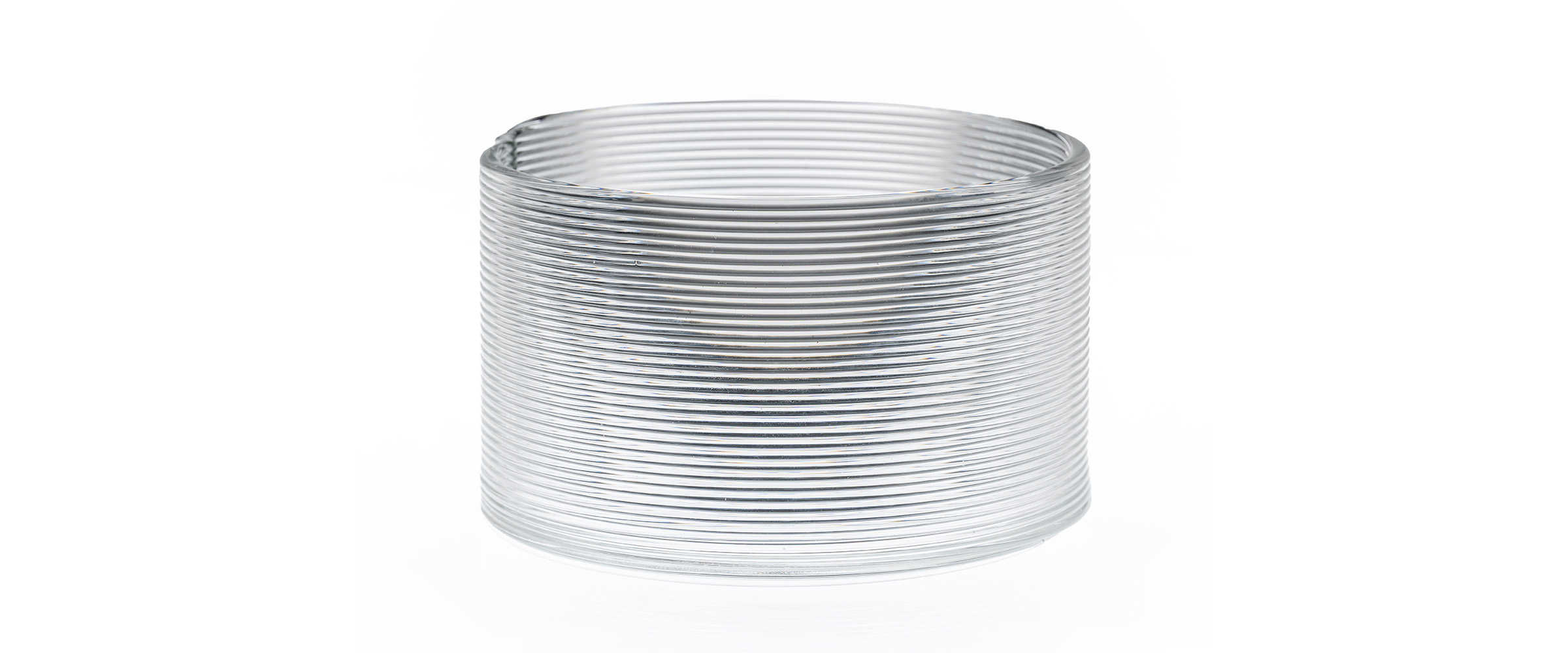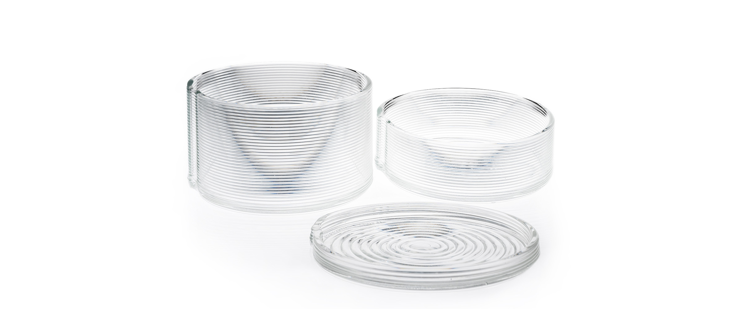 The 3D printed Spiral Vessels series for Evenline were envisioned as a visual story of an object told as a single line traced out with molten glass. This collection was created with three height variants, each defining a utility: Low - for a plate condition, Medium for a bowl condition, and High for a storage condition. The Spiral path remains visible, celebrating process as ornament. Photos by Elizabeth Lamark.